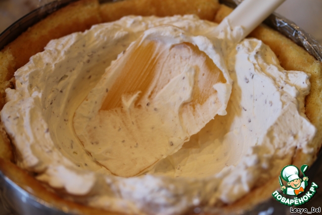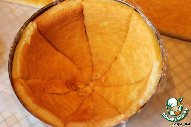 Заполнить половиной этой смеси бисквитную основу так, чтоб в середине осталось углубление. Поставьте в холодильник.