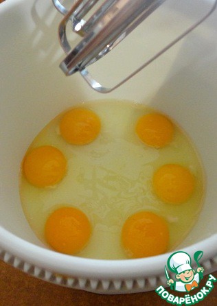 Яйца взбить до увеличения объёма, добавить сахар, продолжить взбивать еще 10 минут.