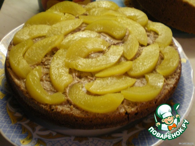 Какао развести в 2 ложках кипящей воды.Масло взбить,продолжая взбивать,добавить какао и сахарную пудру.Персики нарезать тонкими ломтиками.Вынуть тесто из формы и разрезать на 3 горизонтальных слоя.Промазать два нижних слоя половиной получившегося крема,разложить поверх крема кусочки персиков.