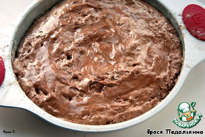 Выложить тесто, выпекать на среднем уровне 25 минут. За 5 минут до окончания выпечки проверить готовность середины торта зубочисткой или шпажкой — они должны быть сухими.