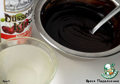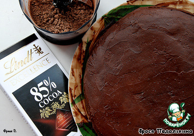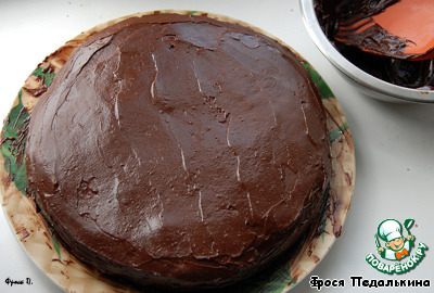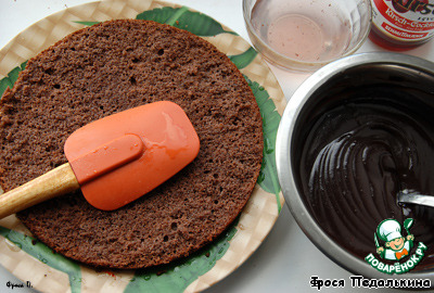 Нижний корж пропитать остывшим сиропом, сверху выложить 1/4 часть шоколадного крема. Сверху уложить следующие коржи, пропитывая каждый сиропом, смазывая 1/4 крема.