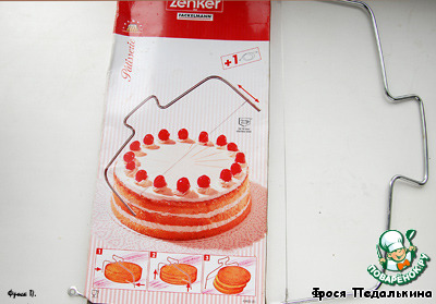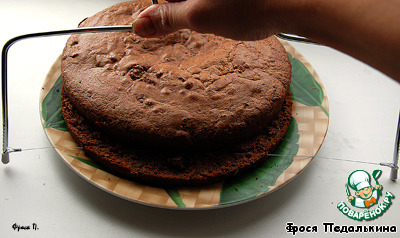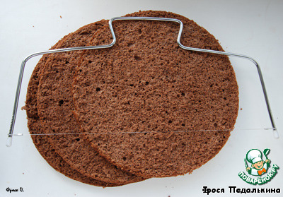 Бисквит разрезать на три коржа. Очень удобно делать это ножом-струной. Просто находка для тех, кто боится резать коржи!