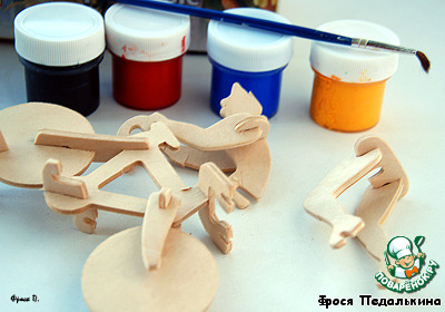 Для оформления я раскрашивала акриловыми красками вот такого деревянного велосипедиста. Правда, к концу съемки случайно сломала ему руку, mille pardons! :-[