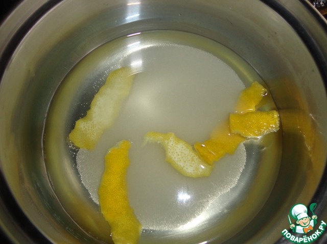 Сварить сироп из воды, сахара, цедры и сока лимона. Остудить.