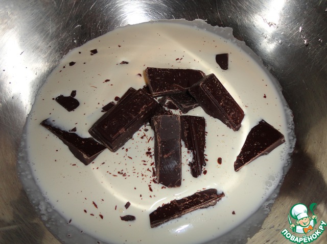 Делаем ганаш. Для этого ставим на водяную баню 200 гр темного шоколада и 200 гр сливок, помешиваем. Как только шоколад растопится, снимаем с водяной бани. Ставим в холодильник.