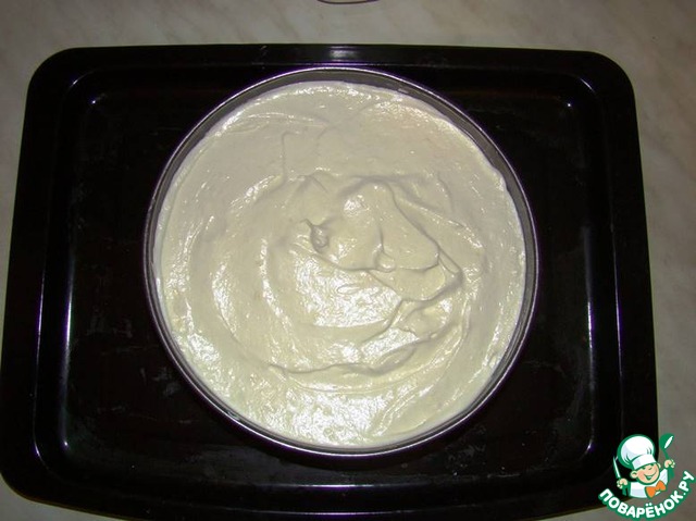 Выкладываем массу в форму (диаметр 20 см) и аккуратно разравниваем. Отправляем в разогретую до 180 градусов духовку на 35-40 минут.