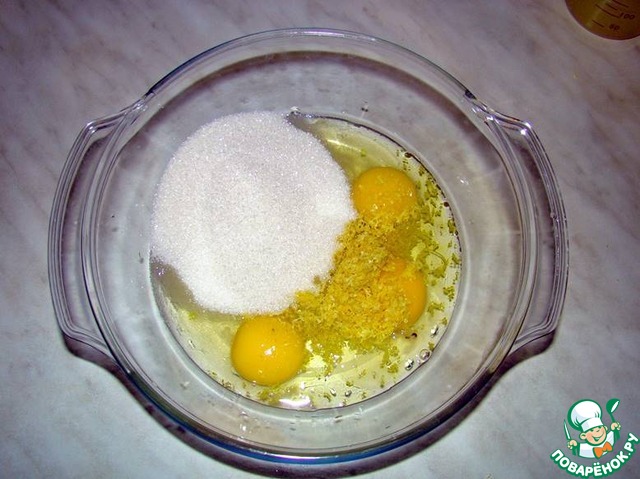 Выдавим 90 мл сока из лимонов. Добавим яйца и сахар. Туда же отправим цедру лимонов.
