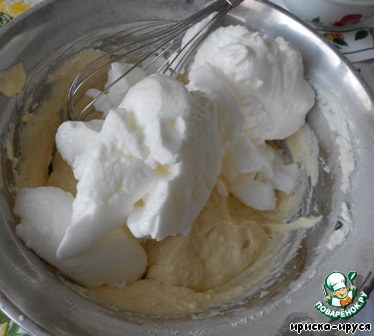 Белки 4 шт. взбить миксером до пиков и аккуратно соединить с приготовленной массой. Тесто готово.