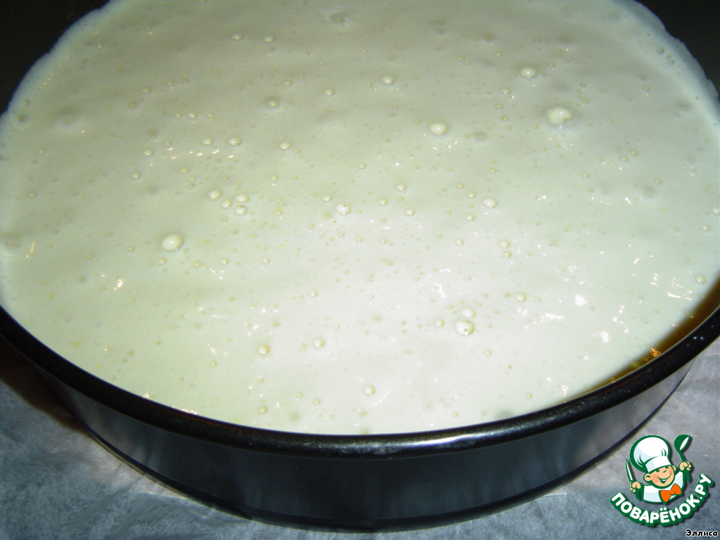 Начинаем процесс с приготовления бисквита. Бисквит должен быть воздушным, поэтому белки нужно взбить в крепкую пену. Тесто нужно готовить непосредственно перед выпечкой, иначе оно осядет и бисквит получится слишком плотным. Белки взбиваем в пену, постепенно добавляя 50 г сахара. Яичные желтки, оставшийся сахар, ванильный сахар, цедру лимона смешиваем, и взбиваем до образования пенообразной массы. Желтковый крем аккуратно соединяем с белковой массой. Муку, крахмал и разрыхлитель смешиваем и просеиваем в яичную массу, осторожно перемешиваем. Дно формы выстилаем пергаментной бумагой, на нее выкладываем бисквитную массу и выпекаем при 175 гр. Примерно 35 минут.