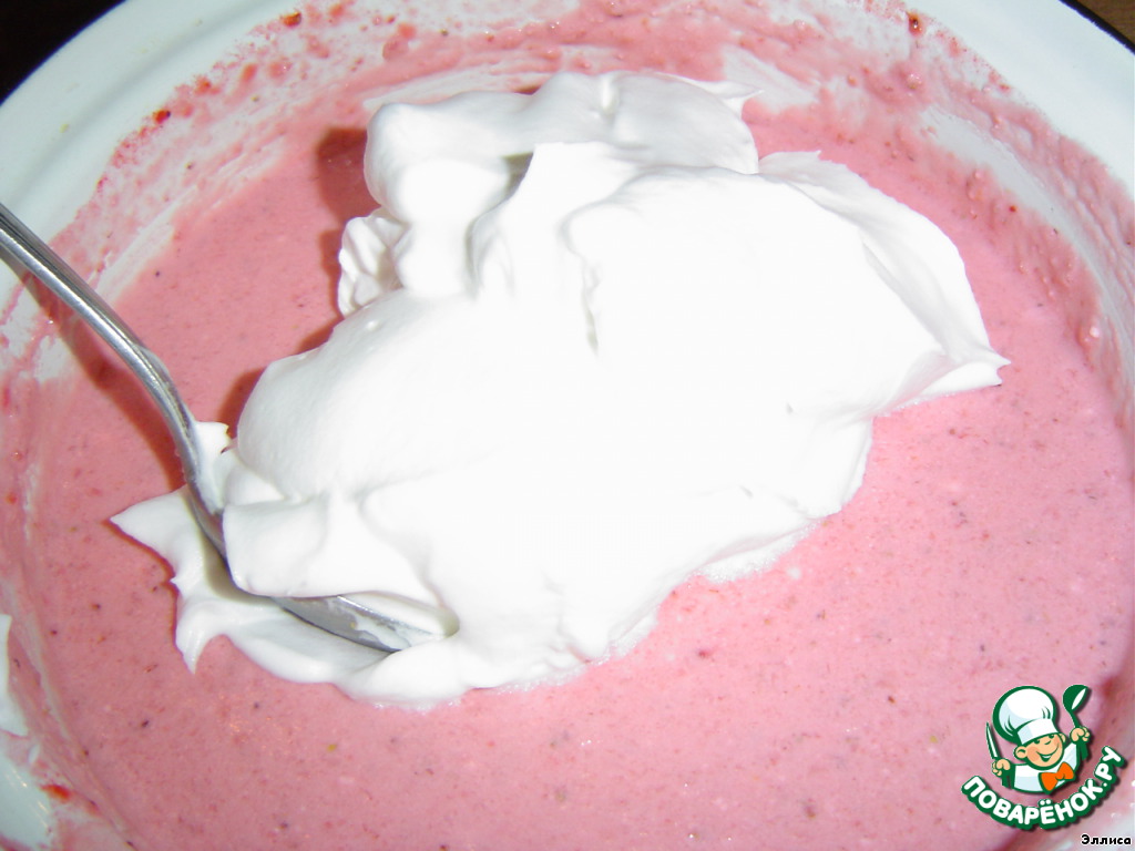 Половину абрикосов и клубники размять в пюре. Желатиновый раствор смешать с творогом, а затем разделить творожную массу на две равные части, а затем смешать одну часть с абрикосовым пюре, а вторую - с клубничным.