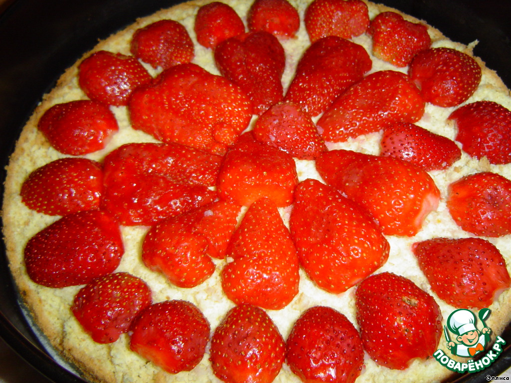 Нижнюю часть бисквита кладем в застеленную пергаментов форму, а на него выкладываем ягоды клубники, а сверху клубничный крем.