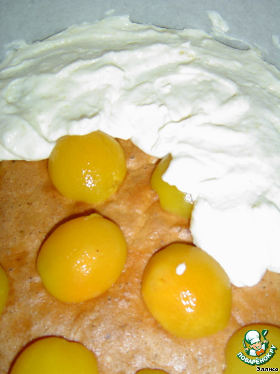 Сверху накрываем верхней частью бисквита и на ней выкладываем половинки абрикосов, а сверху кладем абрикосовый крем. Торт отправляем в холодильник на пару часов.