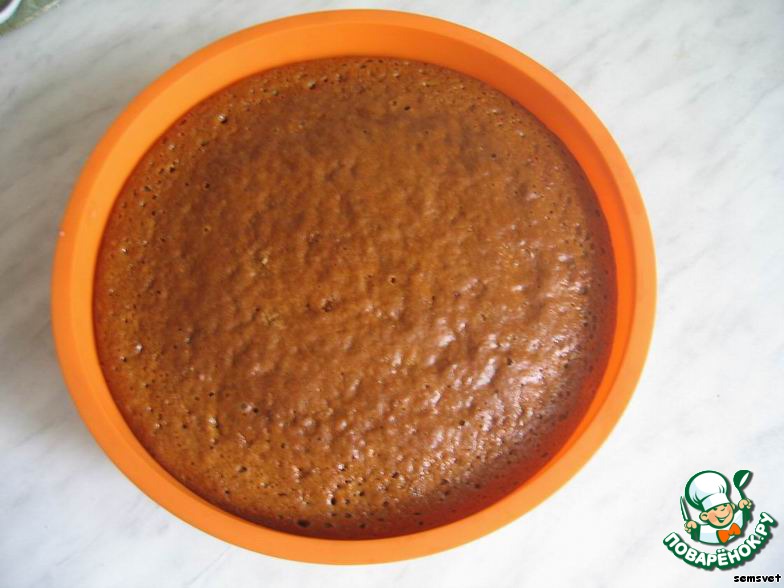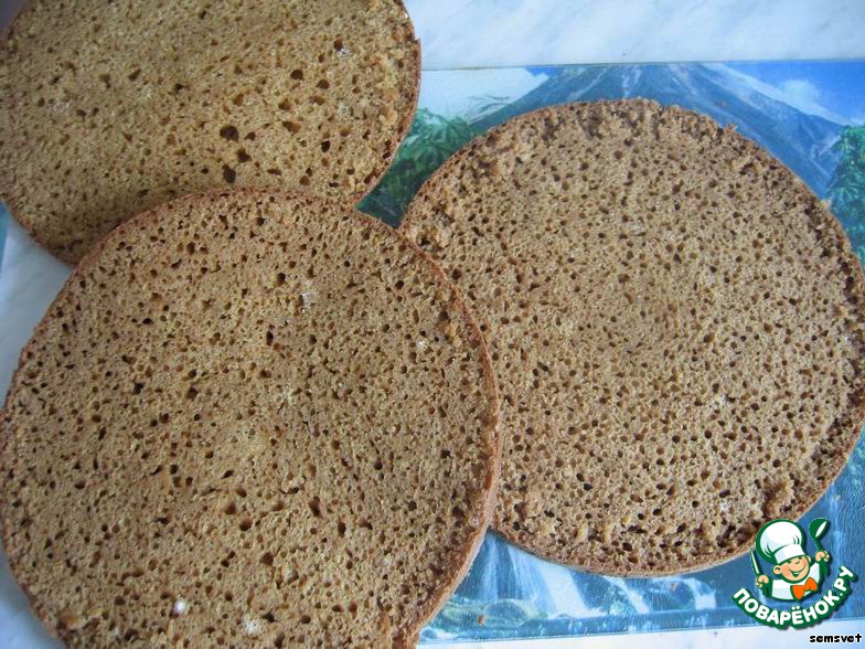 Готовый корж слегка остудить и разрезать на 2-3 пласта.