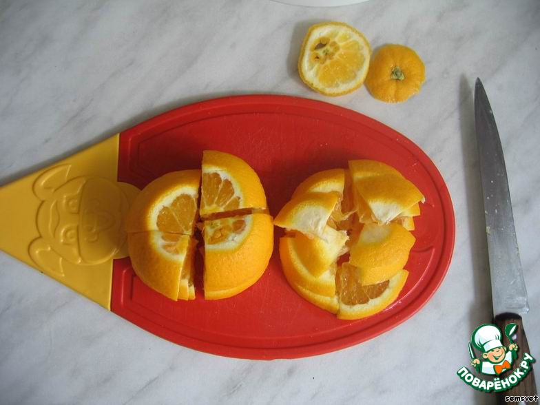 Пока корж остывает, приготовить крем. Для этого надо вымыть апельсин, прямо с кожурой нарезать его сначала кружочками (удалить косточки, попки выбросить), потом эти кружки нарезать на четвертинки.