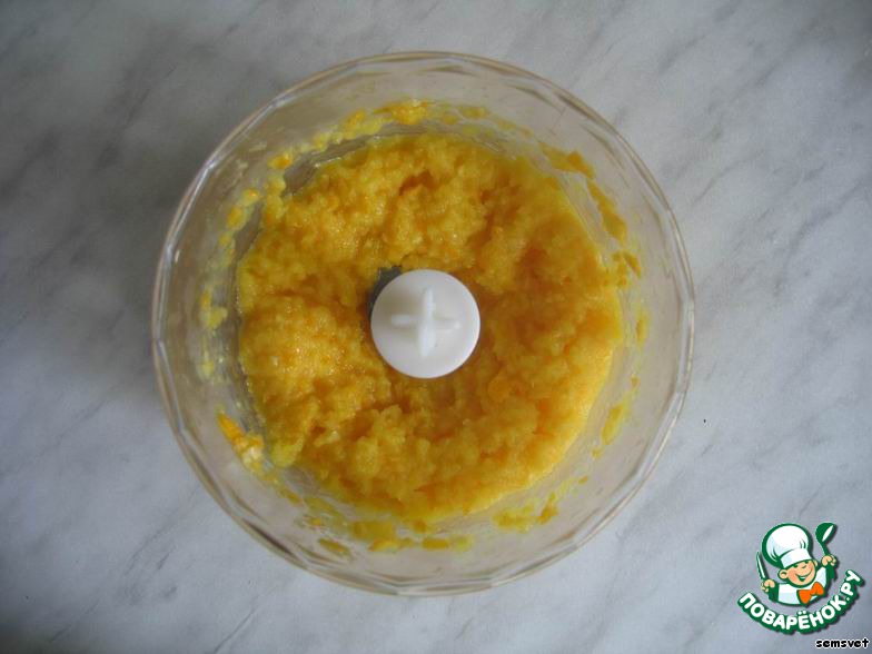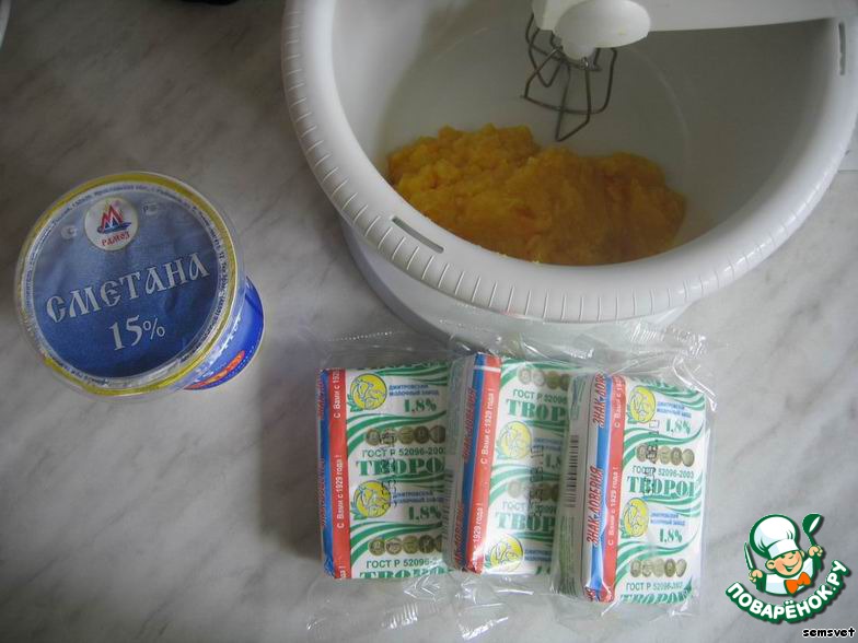 Смешать апельсиновое пюре с творогом и сметаной. Если творог мягкий и сочный, сметана может совсем не понадобиться.