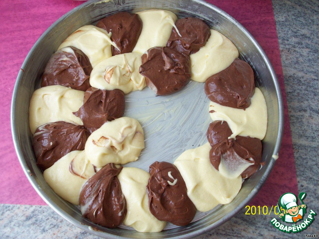 Разделить массу на две части. В одну часть добавить 2 ложки какао.