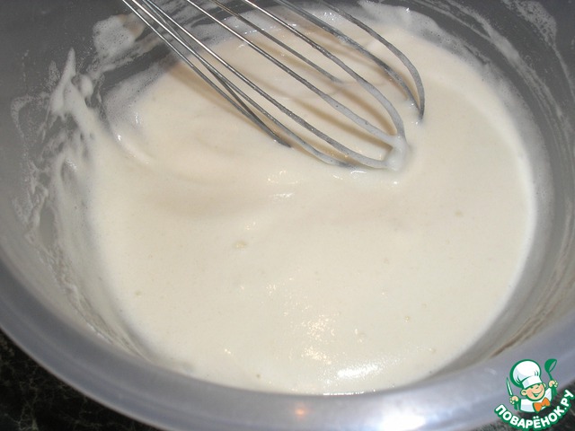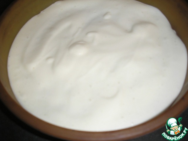 Приготовим бисквит. Белки взбить с сахаром (1,5 ст.л.) и щепоткой соли венчиком, добавить 2 ст.л. муки.