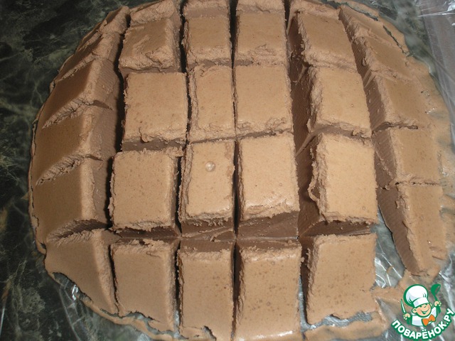 Когда шоколадное суфле в готово, вынимаем из тарелки и нарезаем небольшими кусочками разного размера.