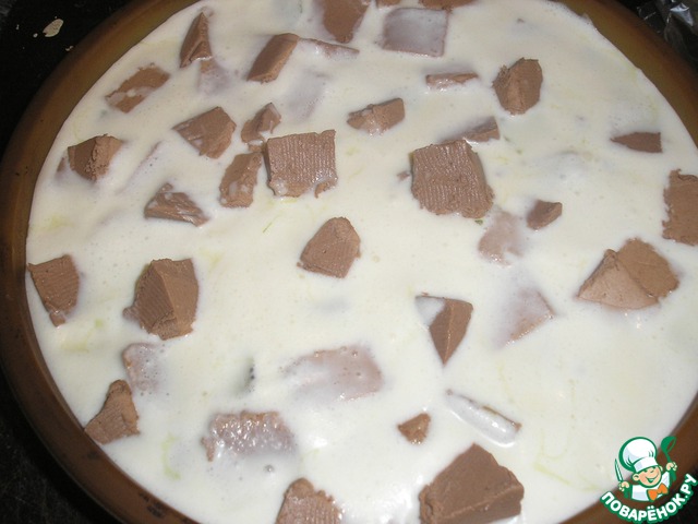 Шоколадное суфле на бисквите уже застыло. Выливаем ванильное суфле в форму с бисквитом. Выкладываем кусочки шоколадного суфле так, чтобы несколько кусочков возвышались над белым суфле. Отправляем торт в холодильник Точно время застывания сказать не могу. Делаю торт вечером, и оставляю в холодильнике на ночь.