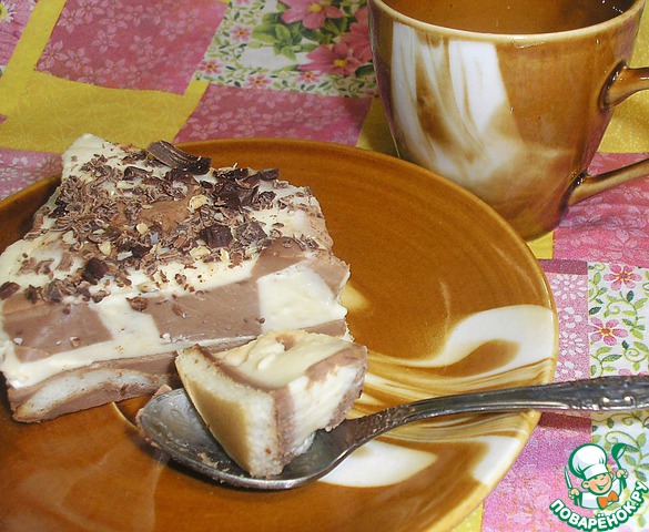 Торт состоит из бисквитной основы, шоколадного и ванильного суфле. В разрезе получится белое суфле с кубиками шоколадного суфле.