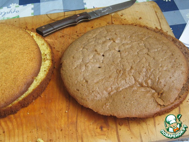 Выпечь 2 коржа (180 град. минут по 20-30 выпекается каждый) и разрезать их пополам