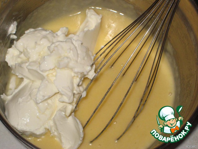 Во фруктово-шоколадную смесь добавить сливочный сыр и взбить в однородную смесь. Охладить.