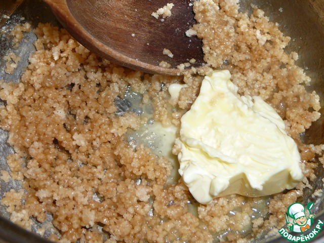 Готовим карамельный соус. Насыпаем коричневый сахар в кастрюльку и плавим его на небольшом огне до состояния карамели.