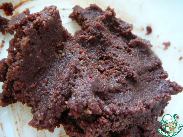 В это время размалываем орехи, смешиваем крошку с мягким шоколадом и маслом. Растираем массу до однородности.