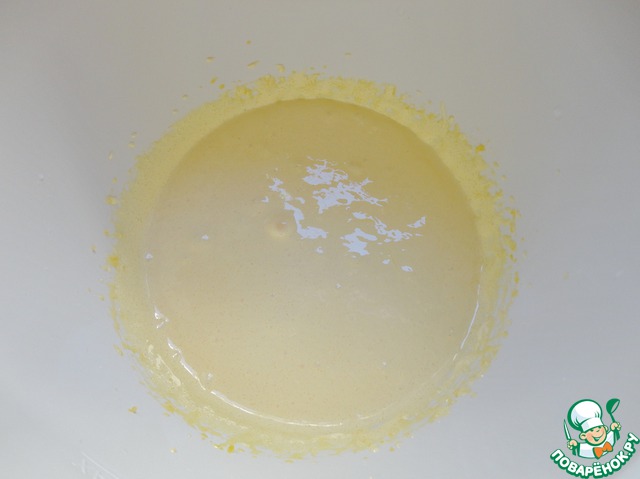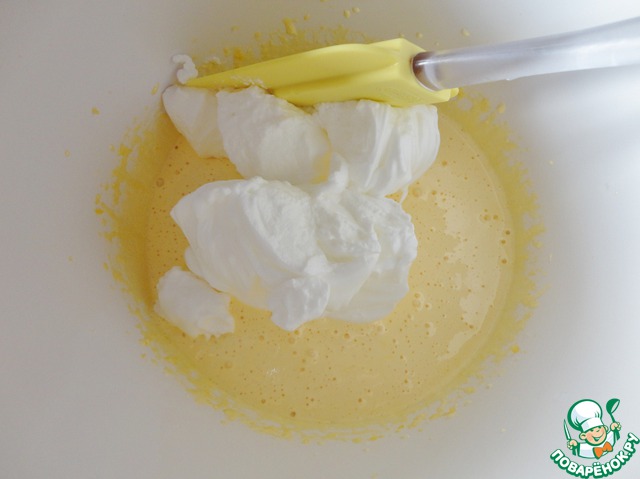 Добавляем половину взбитых белков во взбитые желтки, аккуратно перемешивая лопаткой.