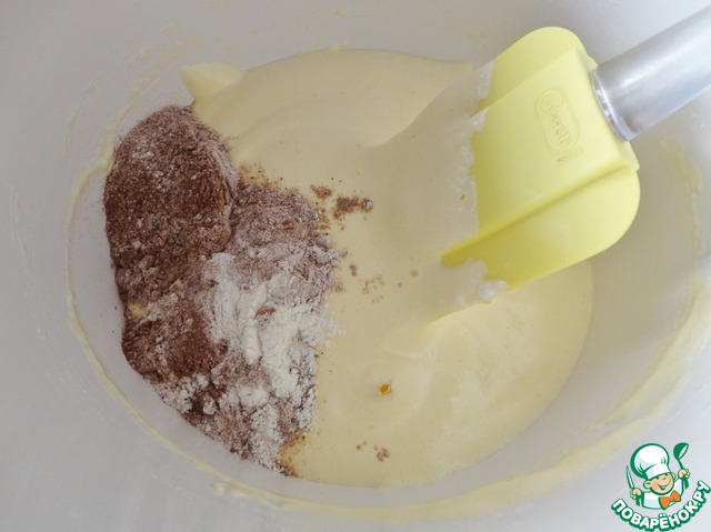 По частям добавляем мучную смесь во взбитые с сахаром яйца. Перемешиваем аккуратно лопаткой движениями снизу вверх и по кругу.