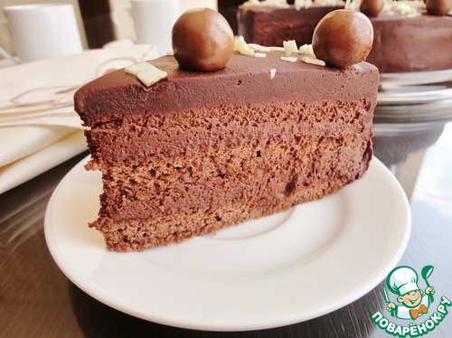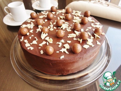 А теперь я расскажу вам о том изменении, которое внесла в рецепт. У автора торт украшен просто шоколадными шарами, я же не удержалась и слегка посыпала его кусочками белого шоколада.