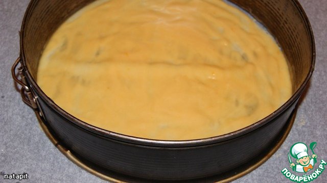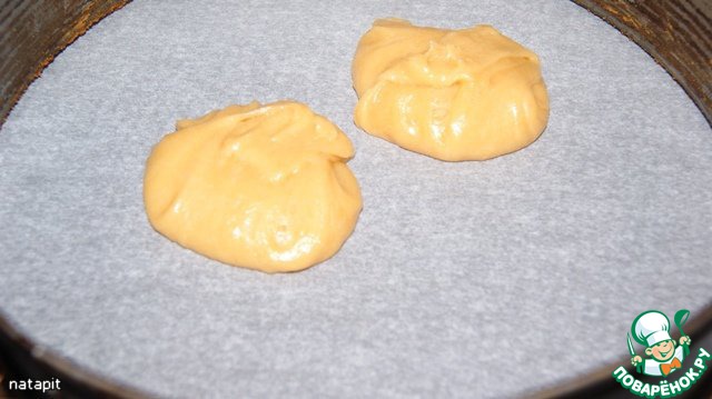 На противень. застеленный пекарской бумагой, поместить ободок от разъемной формы 26 см в диаметре, выложить в него 2 полных ст. л. теста.