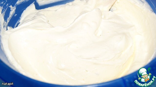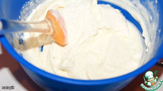 Достать миску с кремом из холодильника, он хорошо загустел. Перемешать.