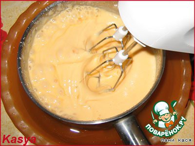 Переставить посуду с желтками в миску с холодной водой и взбить в пену (получается светло-желтая, довольно густая)