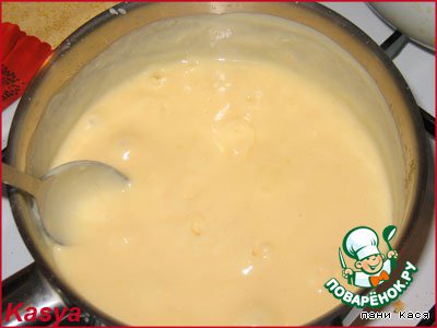 Остальные сливки разогреваем до сильно-сильно теплого, даже горячего, но не кипящего. Аккуратно, постоянно размешивая, вливаем сливки в желтковую массу (мы делали вдвоем, фотографировать некому, лить надо тонкой струйкой, а то желтки свернутся). Размешали - ставим на плиту и доводим до "пыхтения". Снимаем, студим. Прослаиваем коржи (только внутри, не сверху) и оставляем на ночь пропитываться. Оставьте немного крема на обработку бочков.