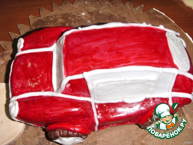 Если у кого есть гелевый краситель и кандурин,то облечаем работу,тем,что несколько капель добавляется в мастику(марципан) хорошо смешиваете,и уже с готовым цветом покрываете машину.Кандурин придает блеск изделиям.