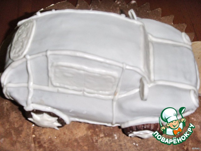 Раскатываем мастику в широкий круг и накрываем машину,руками приглаживаем,придаем форму машинки.
