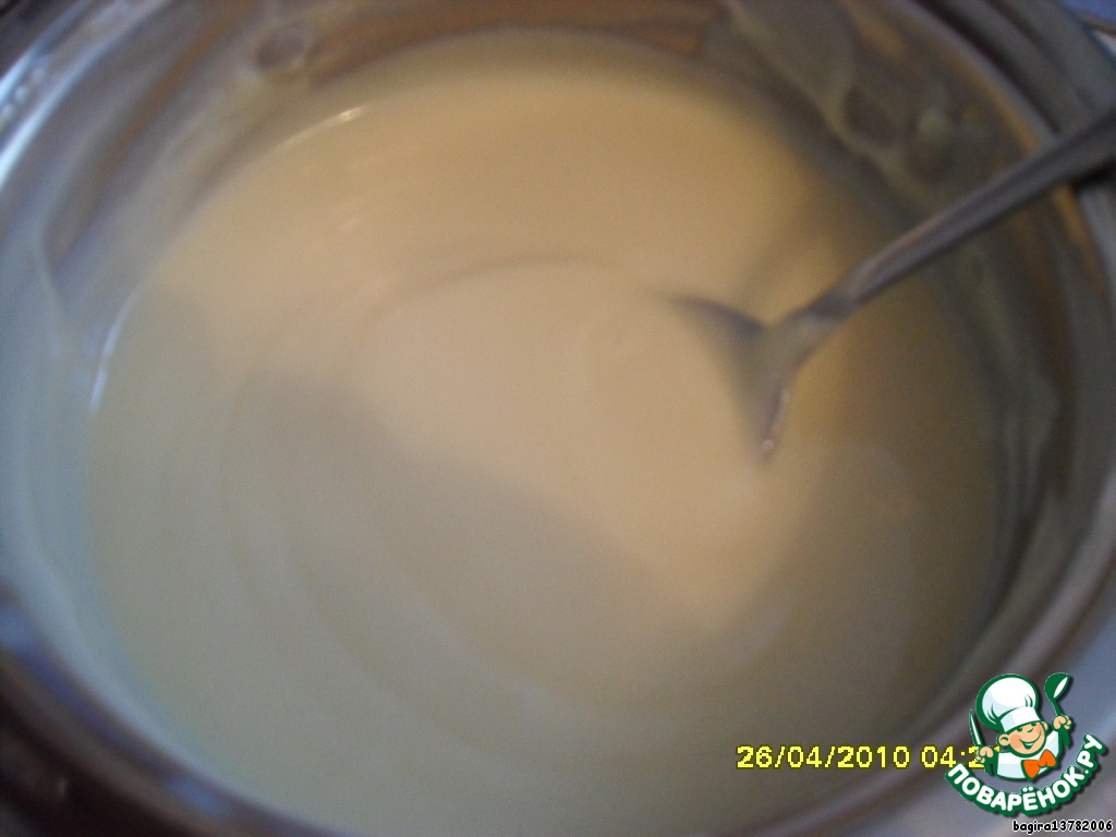 В желтковую смесь аккуратно нальем молоко, хорошенько размешивая. Поставим массу на медленный огонь и уварим до загустения. Не кипятим!