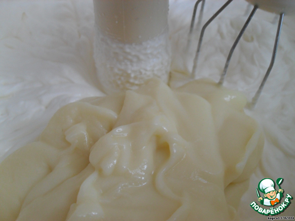 Во взбитые сливки по частям добавляем заварной крем и аккуратно смешиваем обе массы. Сливки и заварной крем должны быть одинаковой температуры - из холодильника.