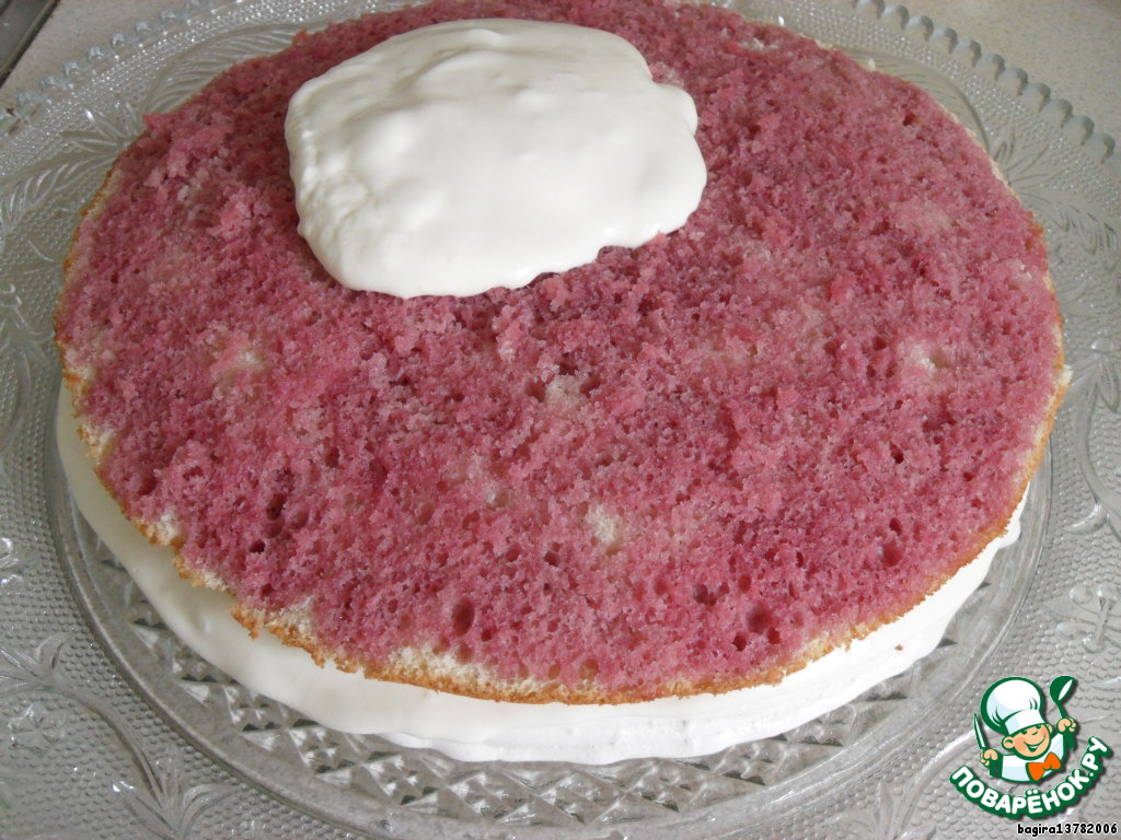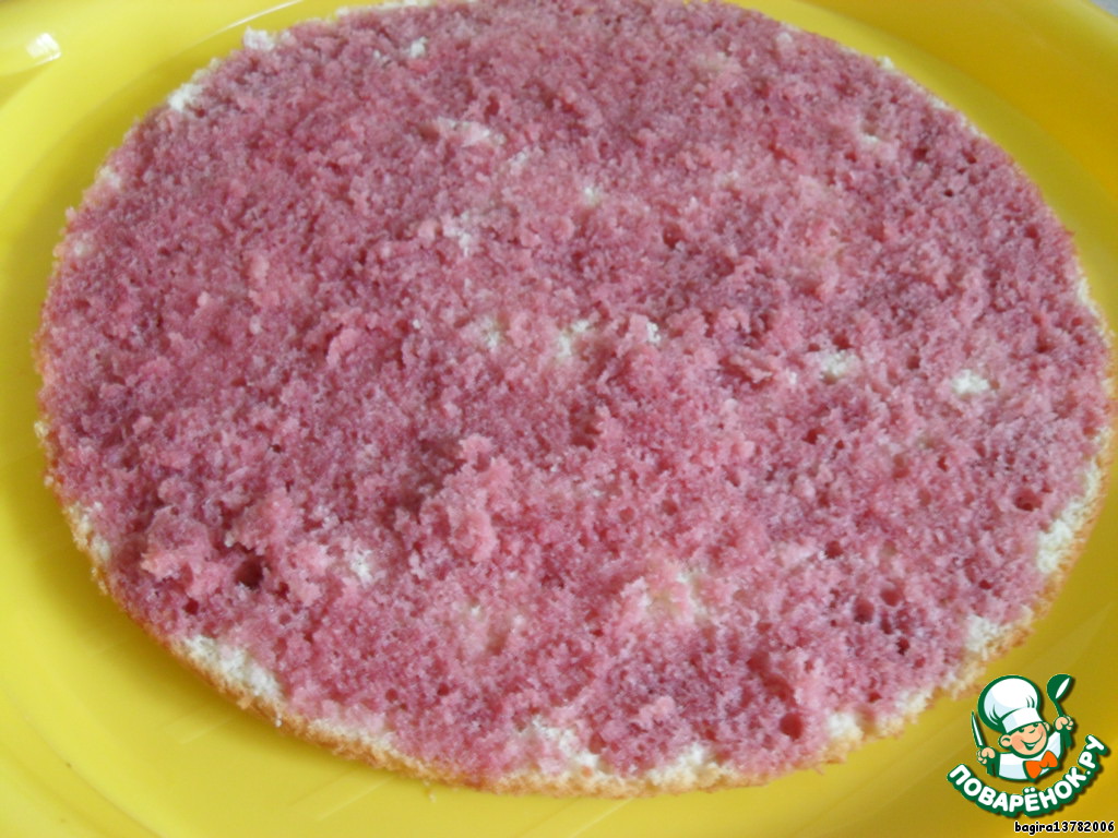 Бисквитные коржи пропитываем клубничным соком. Степень пропитки можно регулировать по своему вкусу - "помокрее" или "посуше", в связи с чем норма сока может отличаться от указанной в рецепте.