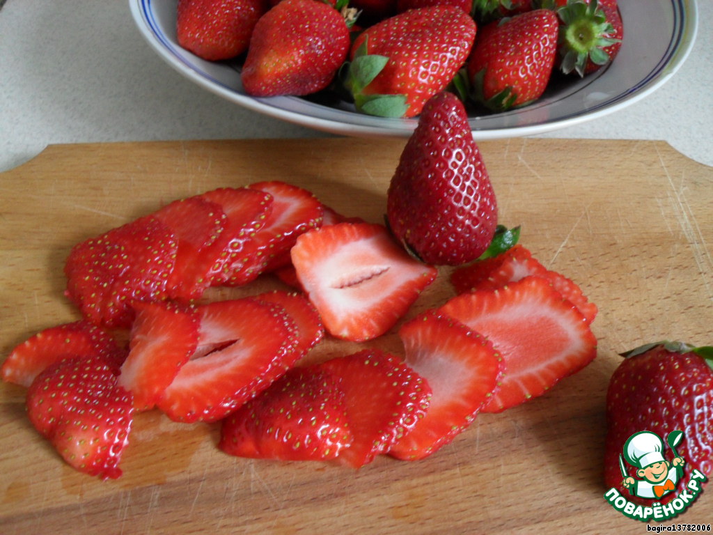 Клубнику нарезаем на тонкие пластинки или кусочки. Оставляем несколько целых ягод для украшения.