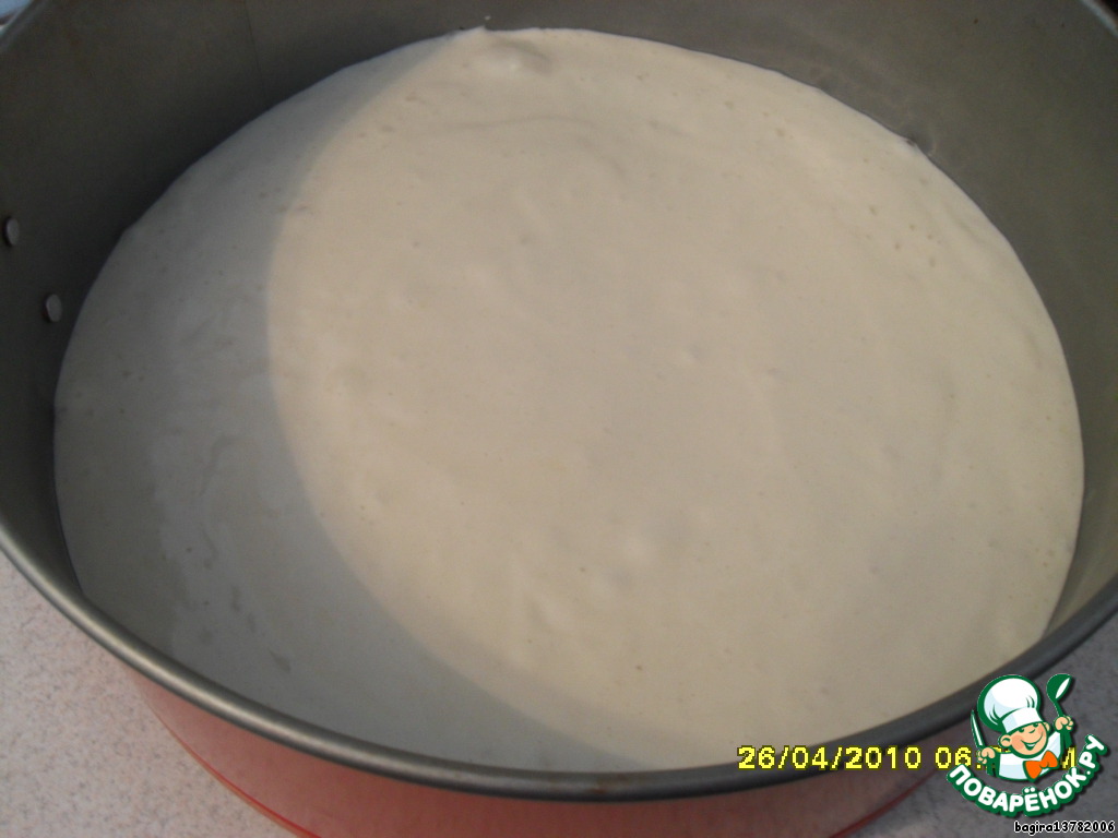 Форму (22 см) смазываем маслом и слегка присыпаем мукой (я кладу на дно бумагу для выпечки). Выкладываем тесто в форму.