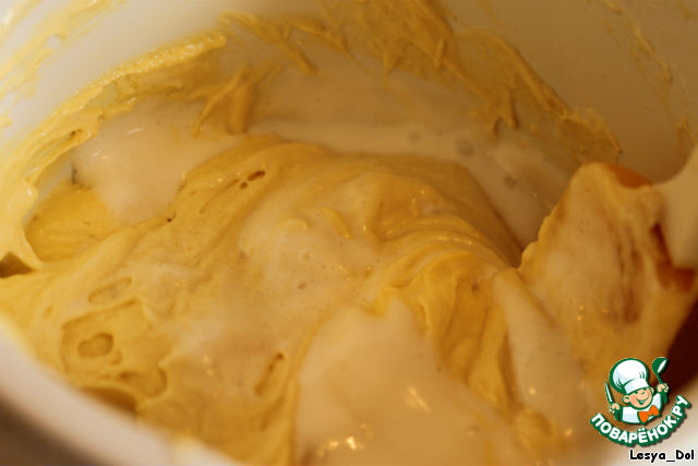 Взбить белки со щепоткой лимонной кислоты и оставшимися 50 г сахара до средних пиков. Осторожно вмешать лопаткой в тесто.