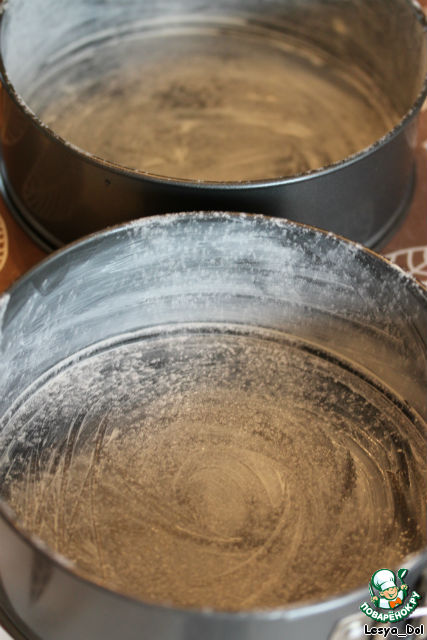 Две формы диаметром 18-20 см смазать сливочным маслом и посыпать мукой, остатки муки вытряхнуть.