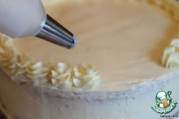 Смажьте один из коржей половиной крема, сверху положите другой корж, верх и бока тоже смажьте кремом.
