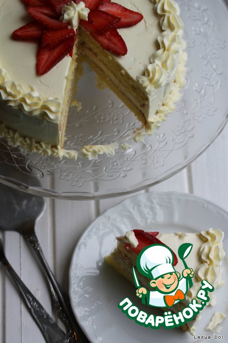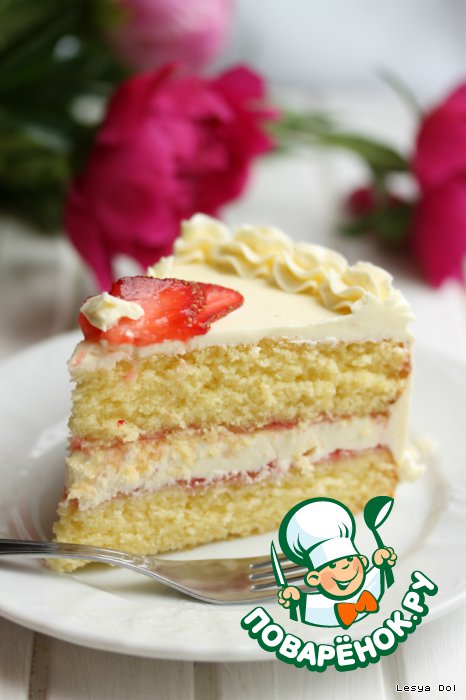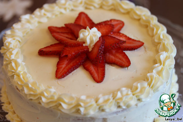 | В принципе, это простой бисквитно-масляный торт. Но только бисквит не совсем обычный, очень сочный, даже не требующий пропитки, а крем не масляный, а масляно-сырный. В качестве "изюминки" я пропитала бисквиты клубничным соусом, который готовлю впрок каждый год в сезон клубники. Этот тортик очень хорошо смотрится на праздничном столе и станет настоящим украшением Вашего праздника. Очень вкусным украшением. ))) |