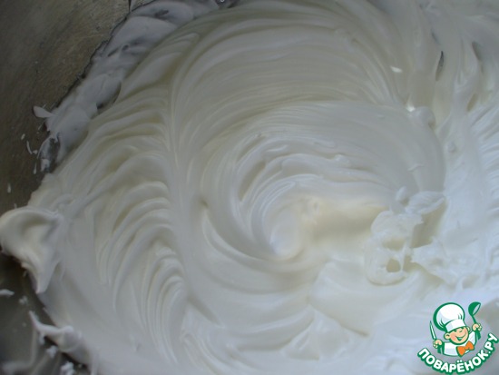 Белки (6 шт.) взбить до устойчивых пиков, постепенно всыпая 70 гр мелкого, быстро-растворимого сахара.