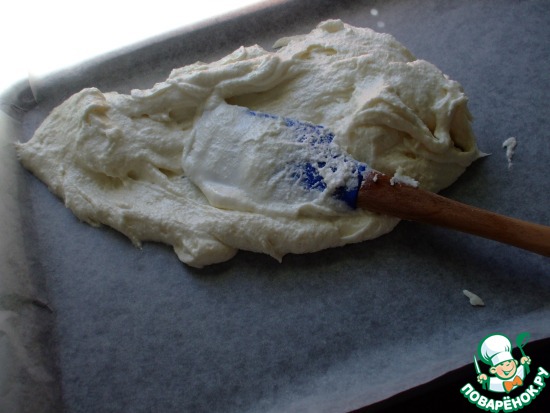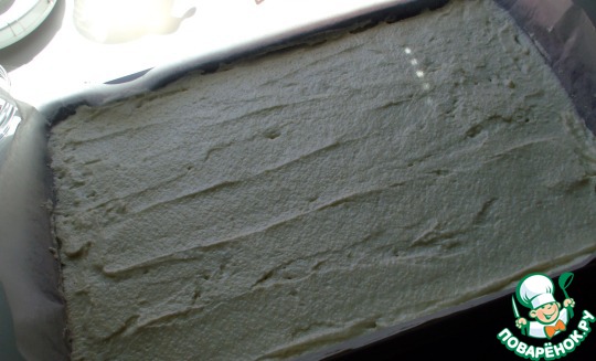 Готовое тесто равномерно размазать кондитерской лопаткой по противню, застеленному пекарской бумагой. Тесто не жидкое, надо именно размазывать. Высота бисквита должна быть около 1 см. Я использовала форму 38 на 26 см.