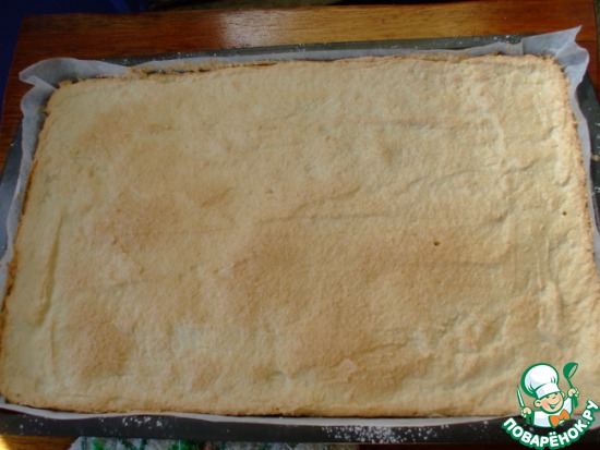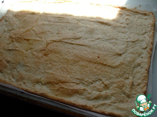 Перевернуть готовый бисквит на подготовленную поверхность, застеленную пергаментной бумагой, и аккуратно снять тот лист, на котором он выпекался.