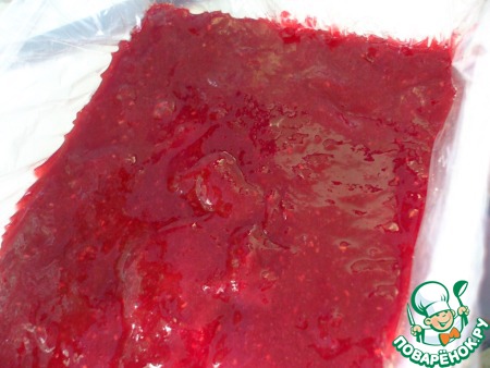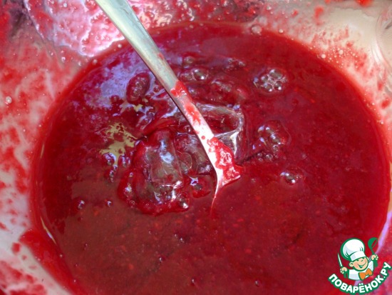 Итак, размороженную малину (300 гр), сахар (35 гр по рецепту), лимонный сок (по вкусу), воду (3 суповые ложки), нагреть на огне, довести до кипения. Протереть через сито, чтобы избавиться от лишних косточек. Добавить заранее замоченный в холодной воде и отжатый желатин (4 гр). Охладить до легкого зажелирования в холодильнике.